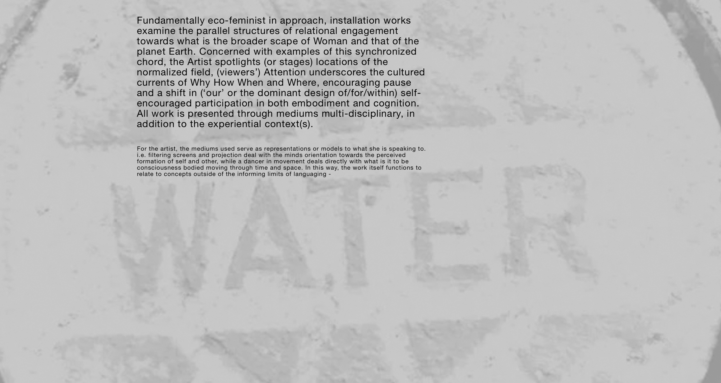 The Artist's work functions in two categories: Choreographed Theoretics and that of the Experiential Arts.